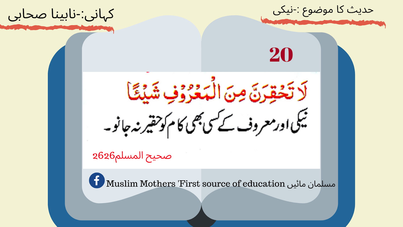 ہماری آج کی حدیث کا موضوع نیکی ہے. جس میں آسان اور سادہ طریقے کا معنی مفہوم سمجھایا جاۓ گا- نیکی کرنا چاھتے ہیں مگر باز اوقات ہمیں یہ بھی معلوم نہیں ہوتا ہ]کہ نیکی کس تیرہ کریں اور اکثر اوقات ہم سب ایسی ناکوں کو حقیر سمجھ کر چھوڑ دیتے ہیں جن کا درجہ اللہ کے ہاں بہت زیادہ ہوتا ہے.