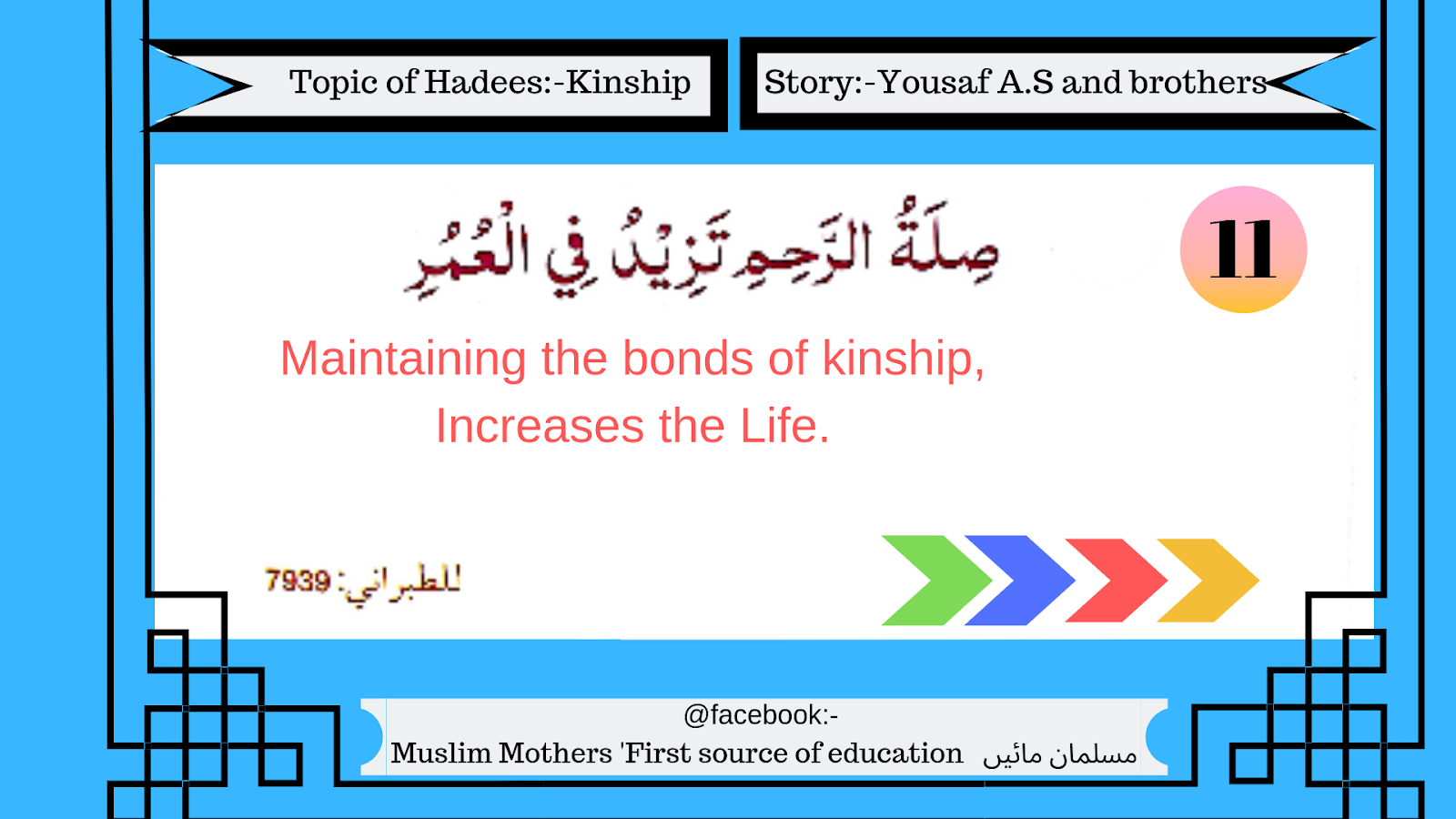 اس حدیث اور متعلقہ کہانی سے بچے بہن بھائیوں اور دوسرے رشتہ داروں سے مضبوط تعلقات بنانا ا ور حسن