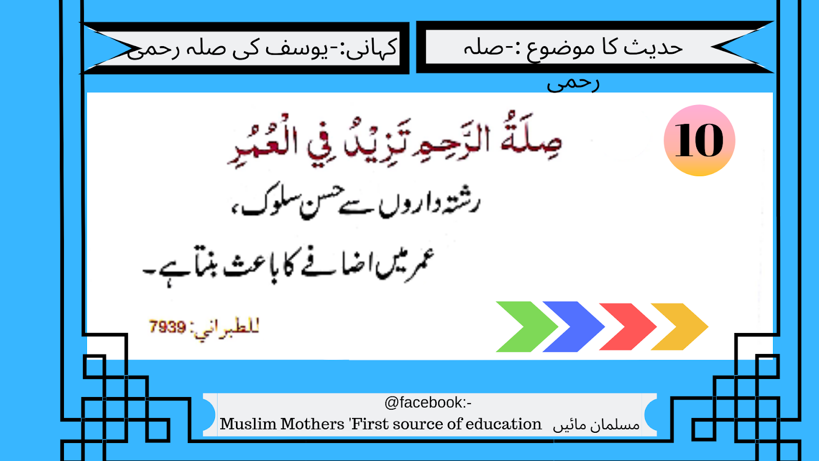 سلوک کرنا سیکھیں گے-آج کے دور میں جہاں بڑوں میں تعلقات کی حدیں بہت حساس ہو چکی ہیں.وہاں بچوں میں بھی مل جل کر کھیلنا اور ایک دوسرے کو برداشت کرنا کم ہوتا جا رہا ہے. مضبوط خاندانی نظام برقرار رکھنے اور دلوں میں محبت پیدا کرنے کے لیے بچوں کی ذہن سازی کی ضرورت ہے.امید ہے کے یہ حدیث اور اس کے ساتھ آ ج کی کہانی بچوں کے دلوں پر ایک گہرا اثر چھوڑے گی . حضرت یوسف کی کہانی سب نے سن رکھی ہے مگر آج اس کو رشتے مضبوط کرنے کے حوالے سے پیش کیا جا رہا ہے