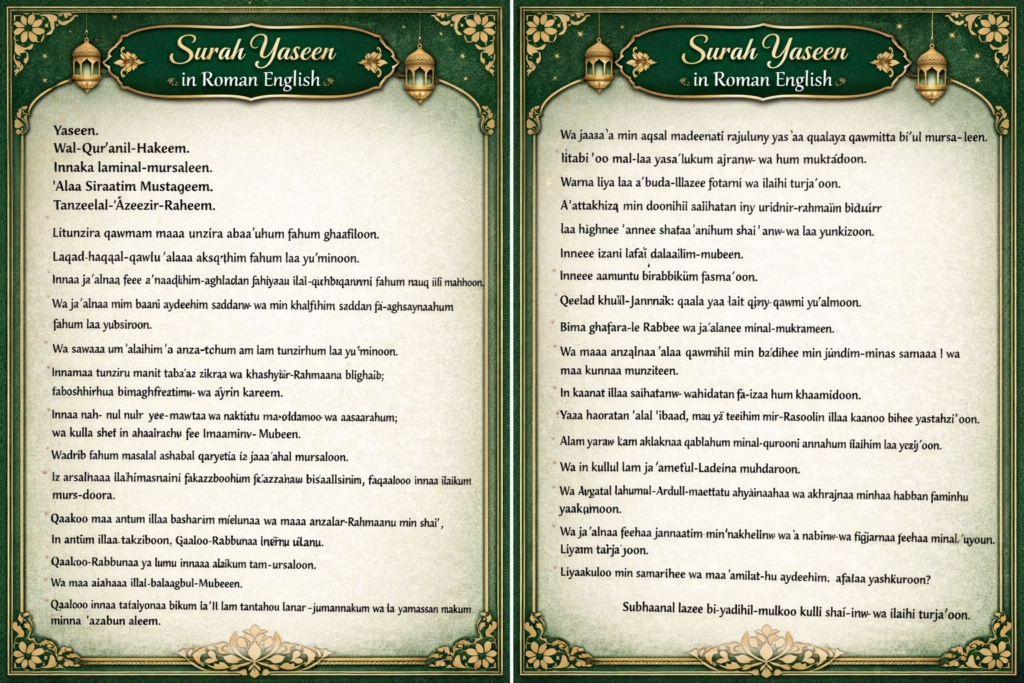 Surah Yaseen is one of the most important chapters of the Holy Quran. It is often referred to as the “heart of the Quran” and is widely recited for blessings, guidance, and spiritual upliftment. For beginners and non-Arabic readers, reading Surah Yaseen in Roman English makes it easier to recite with correct pronunciation and understanding.